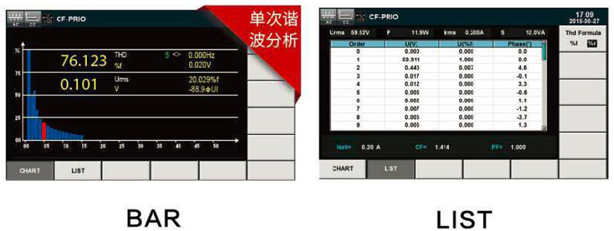 IT8600提供了大的數據量測功能,除了可以測量常規的Vrms、Vpk、Vdc、Irms、Ipk、Idc、W、VA、VAR、CF、PF、Freq等參數外,提供的電壓諧波分析功能,以驗證待測物(不間斷電源UPS,發電機等)。對于電網的諧波干擾,具有50次電壓諧波的分析功能,并且可以以不同形式顯示各次諧波所占百分比的分析結果。