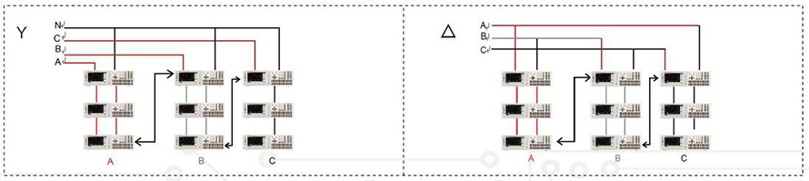 IT8600提供多臺并聯、三相與并聯三相的功能,可以實現對于三相交流電源或者大功率電源的測試應用。在三相并聯應用中,用戶可以根據實際需求實現Y型和Δ型的連接方式,進行自由靈活的搭配。IT8600還可以實現交流380V的輸入,通用,多元的測試需求。