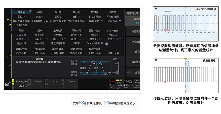 不同于傳統示波器只測一個周期,或通過抽樣減少數據量再測量的模式,ZDS4000系列示波器通過FPGA全硬件并行處理,基于原始采樣率和512Mpts全存儲深度,對每一幀波形每一周期進行測量統計,需約1秒即可實現對512Mpts數據的“真正意義”參數測量,測試項目可達53種,并且支持24種參數同時顯示。這與傳統意義示波器的測量有著本質的區別,也是示波器測試手段與測試方法的突破。