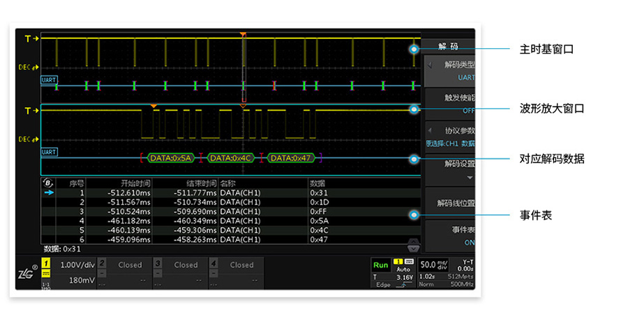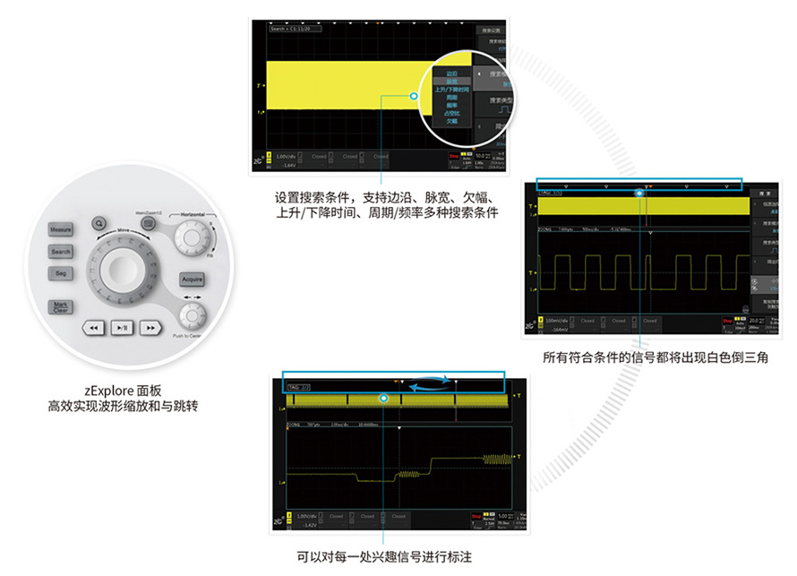 ZDS4000系列示波器不只提供了512M的波形大數據,還配有強大的波形搜索功能和智能標注功能。您可以先通過邊沿、脈寬、欠幅、上升/下降時間、周期/頻率等多種搜索條件來定位512Mpts波形數據中的異常點,再對找出的異常信號使用標注功能,對異常信號進行標注。這里,所有的測量都是經過FPGA全硬件加速,整個過程1S左右即可完成。再對找出的異常信號使用標注功能,對異常信號進行標注。