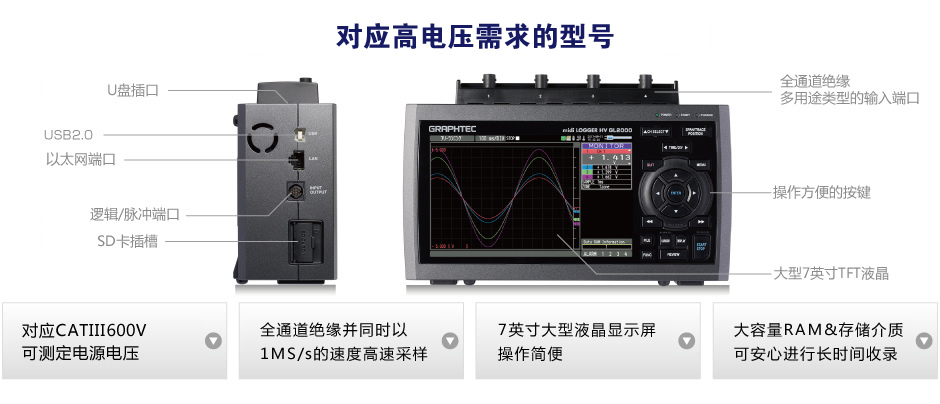 4MW/ch的內置RAM以及4GB內置Flash閃存可提供長時間的測量收錄。