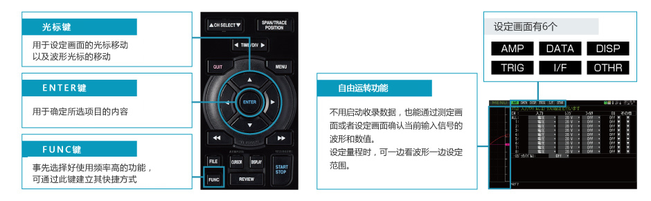 可通過光標鍵和Enter鍵來簡便的操作產品。設置菜單里可以對AMP?DATA?DISP?TRIG?I/F?OTHR這6個內容進行設定。
