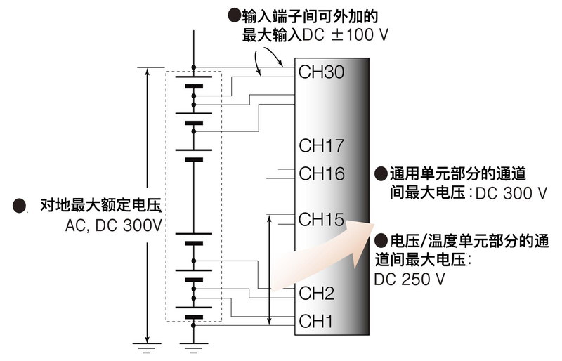 因為通用單元的通道間最大電壓為DC300V和高耐壓,所以能安全的進行測量。
