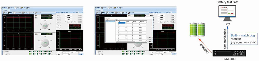 IT-M3100系列具有電池充電功能,可對電池進行充電測試。用戶通過面板就可自行設置電池四種測試關斷條件:關斷電壓、關斷電流、關斷容量和充電時間。當四者中任意一種條件時,即會自動中斷測試。測試過程中可觀測電池的電壓、充電時間和已充電容量。同時,IT9000機軟件配置看門狗功能,為用戶提供的自動化測試方案。